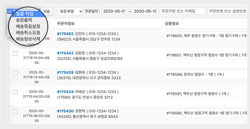 우리 쇼핑몰의 주문 리스트에서 운송장 발급을 바로 진행하며,