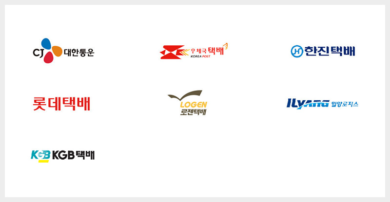 CJ 대한통운, 우체국택배, 한진택배, 롯데택배, 로젠택배, 일양로지스, KGB택배를 지원합니다.