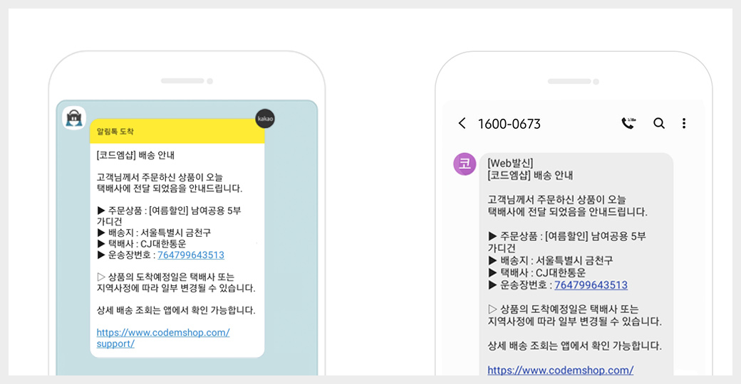 모든 쇼핑몰에서 배송 안내 및 배송 조회 서비스를 문자 또는 알림톡으로 메시지를 전달하고 있습니다. 상품이 언제 도착할지 궁금해하는 구매자에게 문자 또는 알림톡으로 배송 정보 메시지를 전달 해 주세요.