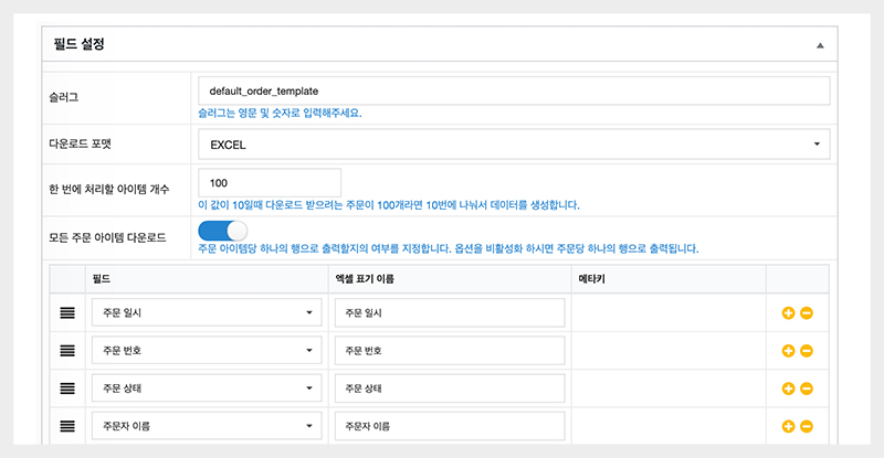 – 상품 ID, 상품명, 주문 아이템명, 주문 옵션명, 주문 수량
