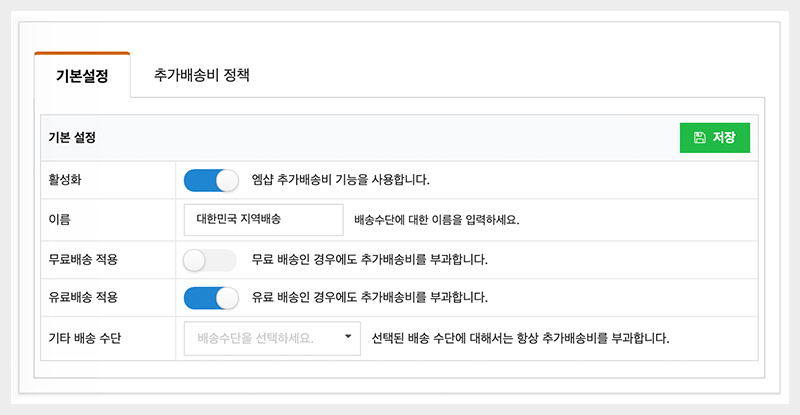 기능 설정 화면의 간단한 인터페이스로 추가 배송비를 손쉽게 설정 할 수 있습니다.