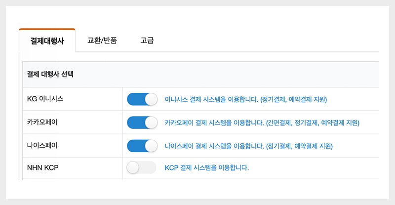 쇼핑몰 고객이 다양한 만큼 고객들이 선호하는 결제수단도 다양합니다.