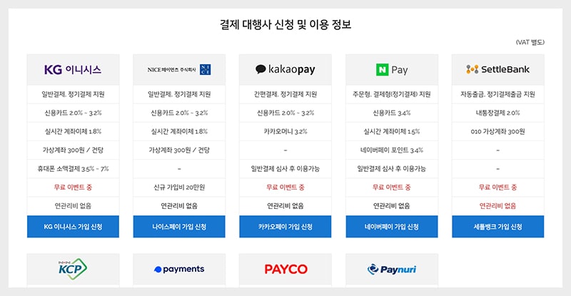 여러 PG사의 여러 결제수단을 한번에 신청 후 이용하실 수 있습니다.