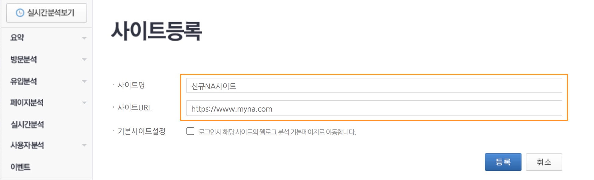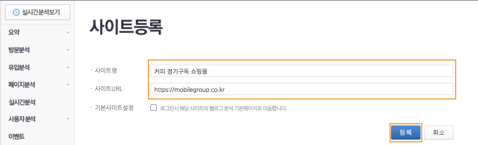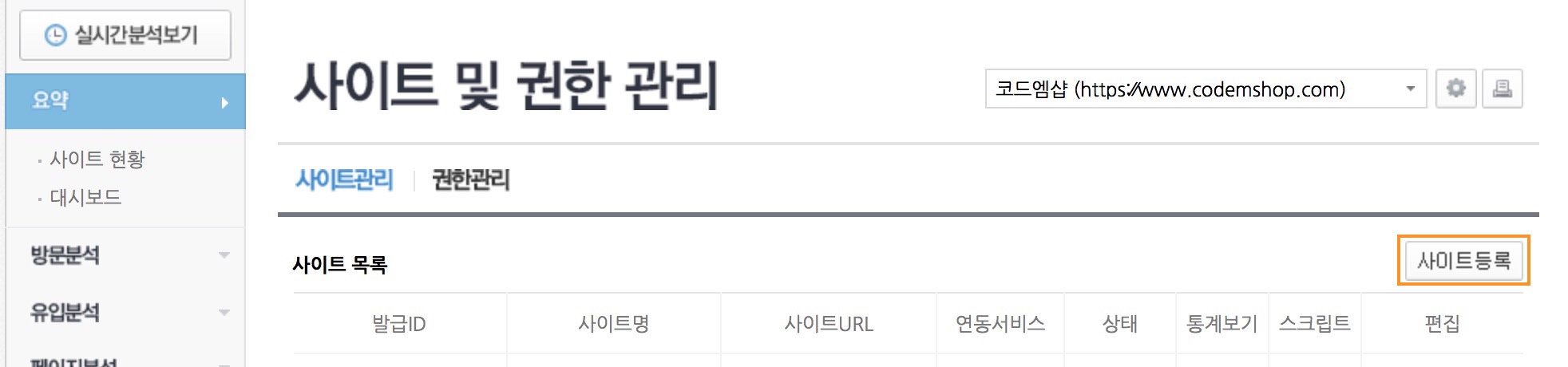 2. 사이트 등록 버튼을 클릭 후 사이트명과 사이트 URL 를 등록 합니다.