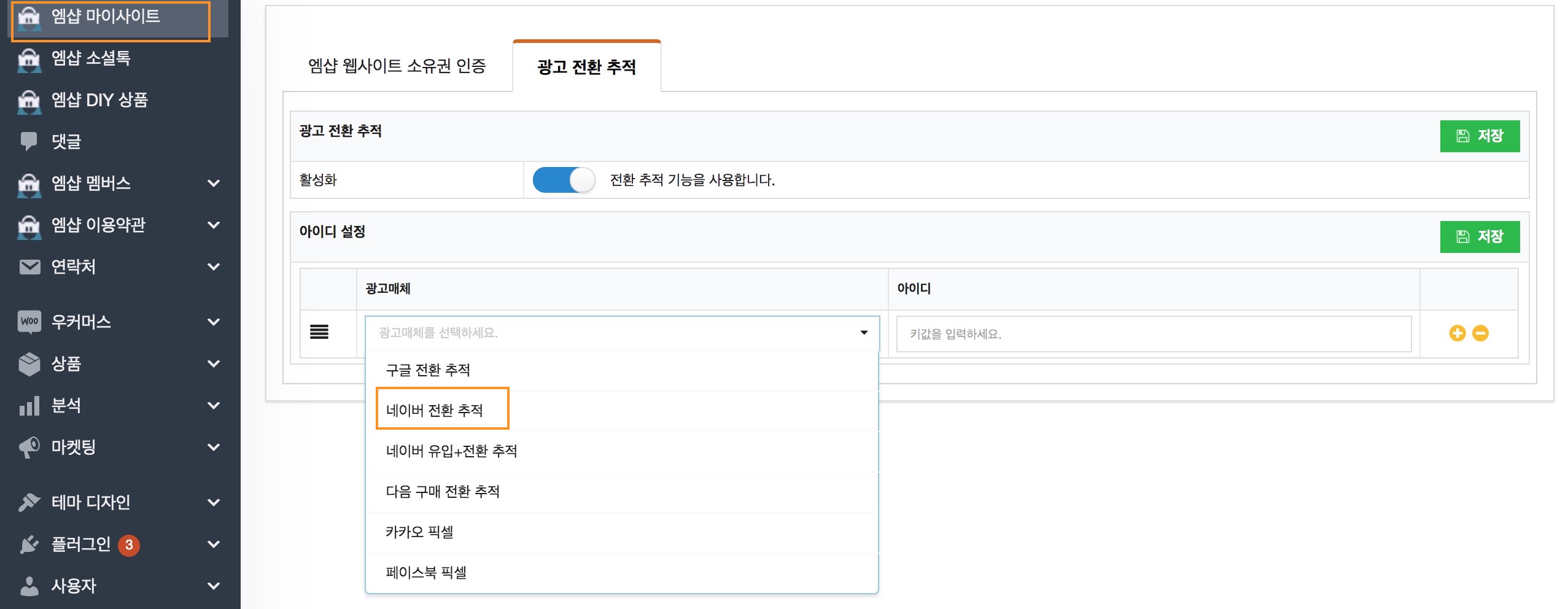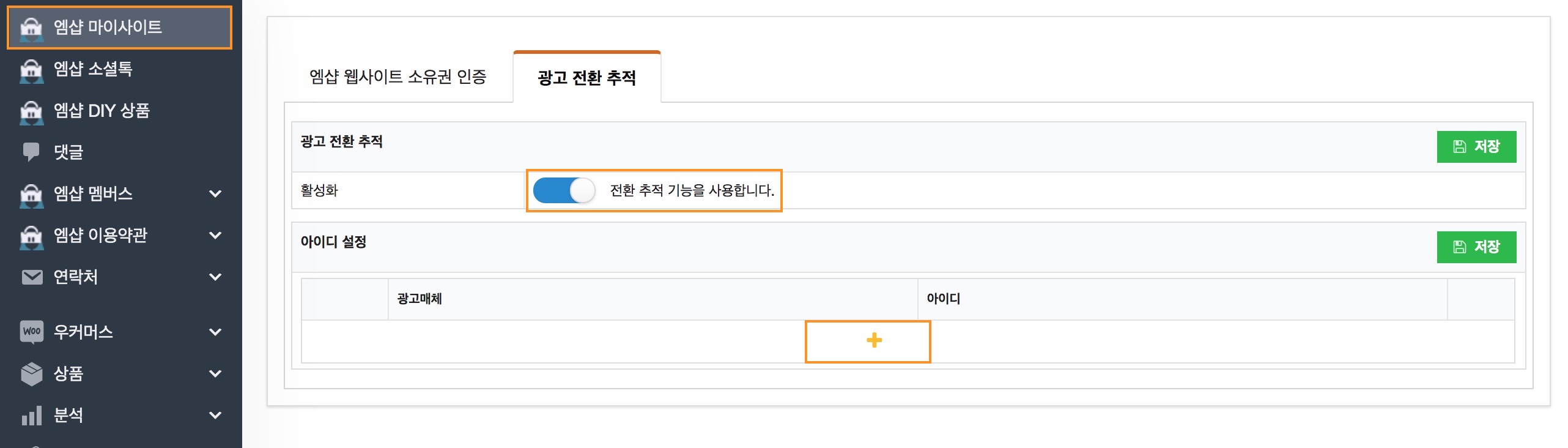 2. 플러그인 메뉴 – 엠샵 마이사이트 – 광고 전환 추적 탭을 선택 후 활성화 클릭 합니다.