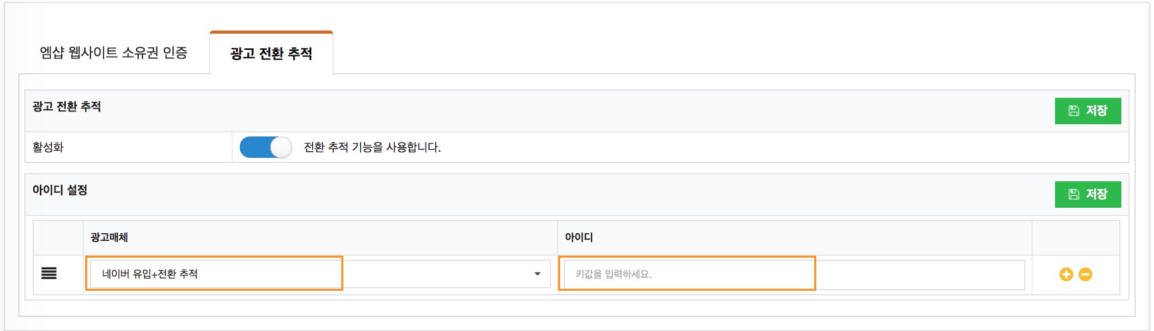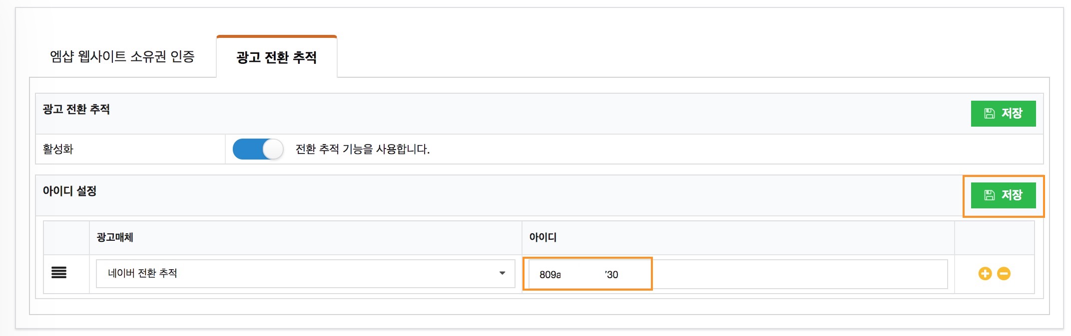 3. 아이디 설정 – 광고 매체를 네이버 전환 추적으로 선택 후 네이버 애널리틱스에서 발급 받은 발급 ID 를 복사 후 등록 합니다.