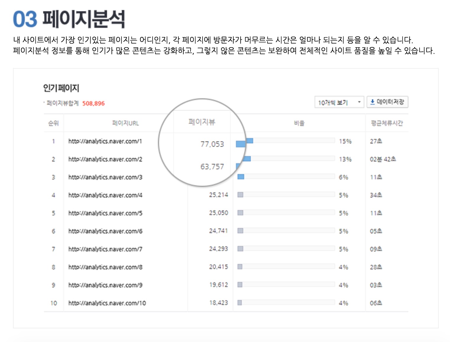 페이지 분석 – 인기 페이지 URL, 페이지뷰, 비율, 평균 체류시간