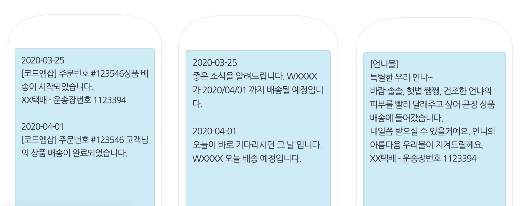 쇼핑몰의 기본 기능 중 하나인 문자 알림 기능은 회원가입부터, 안전하게 결제가 이루어졌는지를 시작으로 배송 처리 여부 등의 문자 알림 등을 발송하게 됩니다.