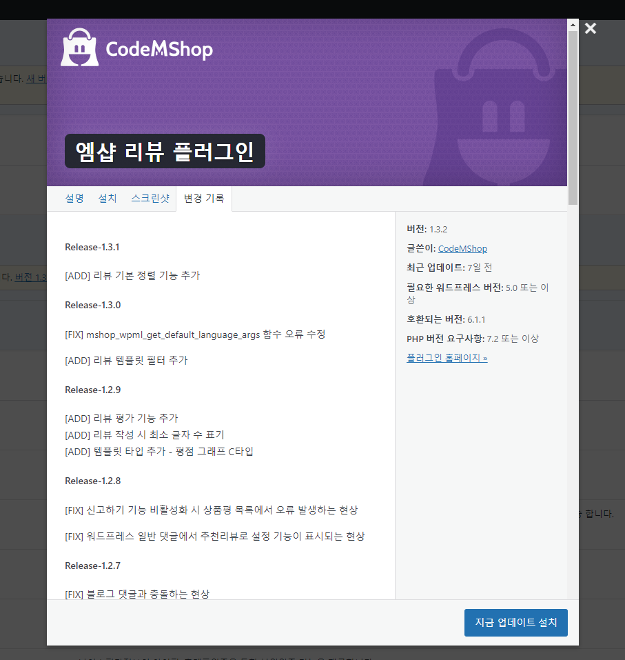 – 플러그인 상품 페이지 업데이트 로그 탭 확인