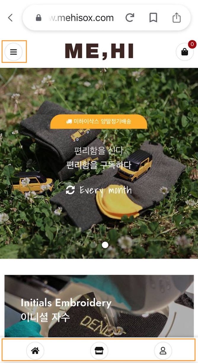 모바일에서의 햄버거 메뉴, 마이페이지, 메인 홈 등을 아이콘으로 표기 해줌으로 인해 쇼핑의 편의성을 제공하고 있죠.